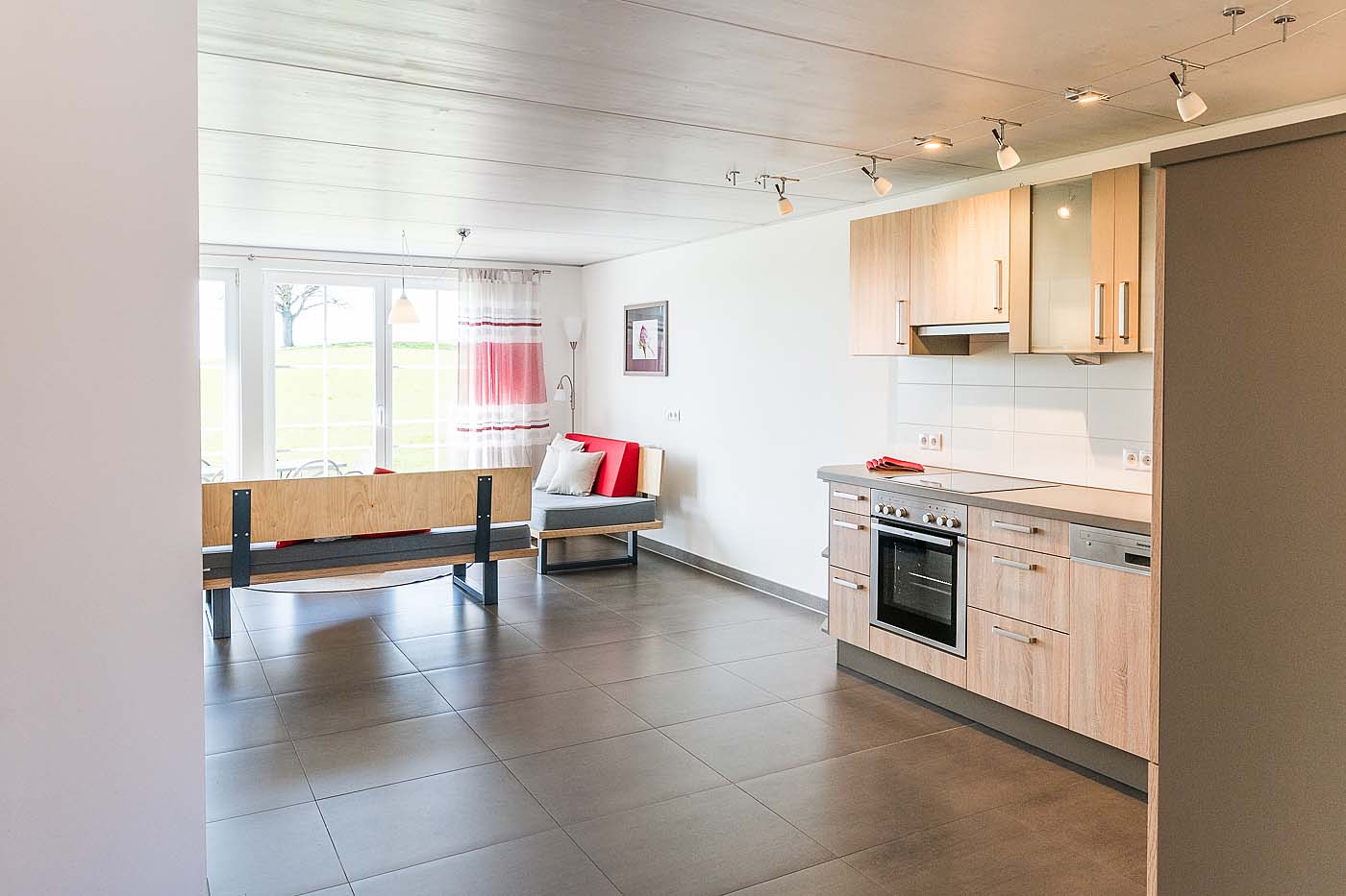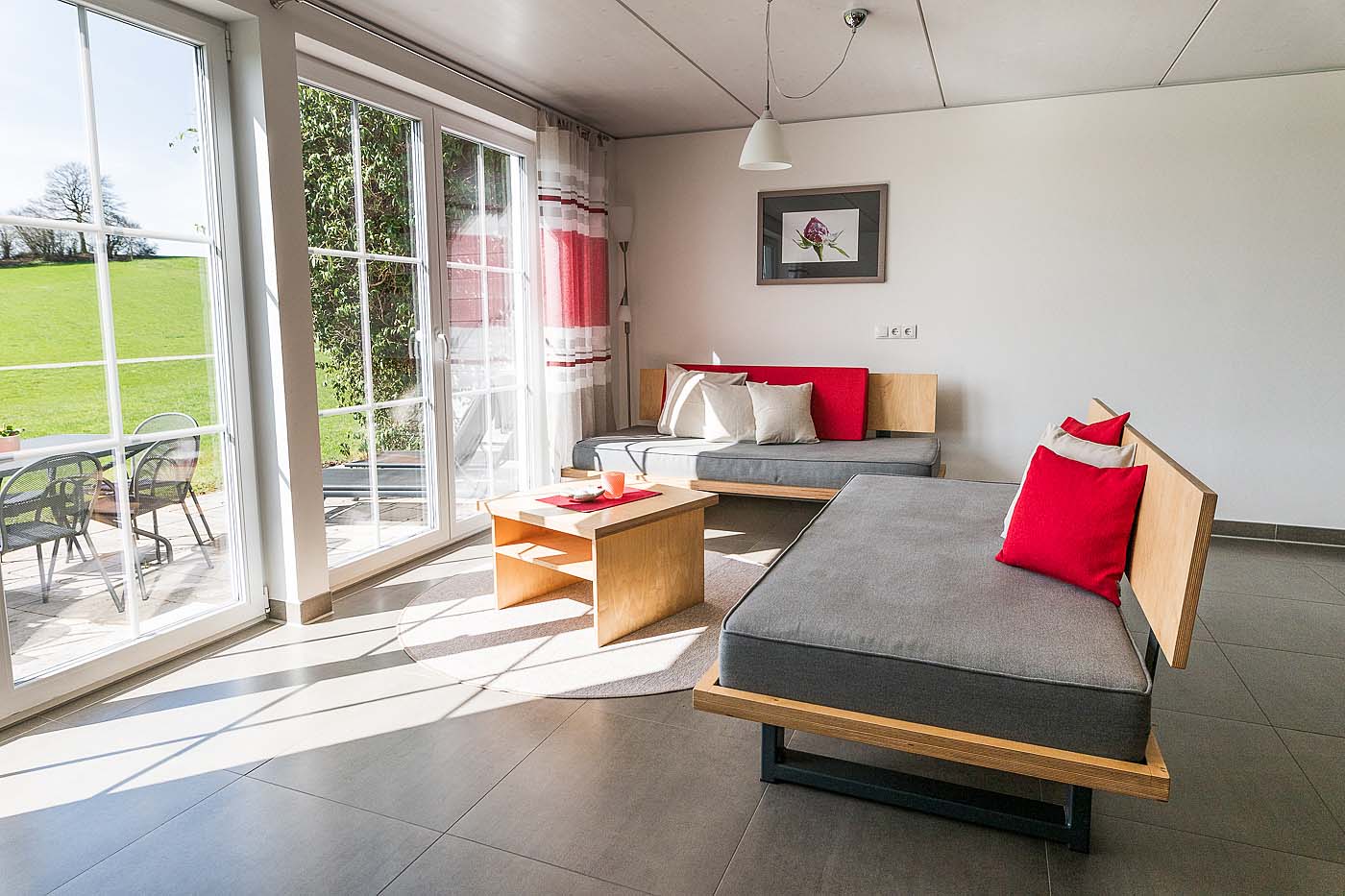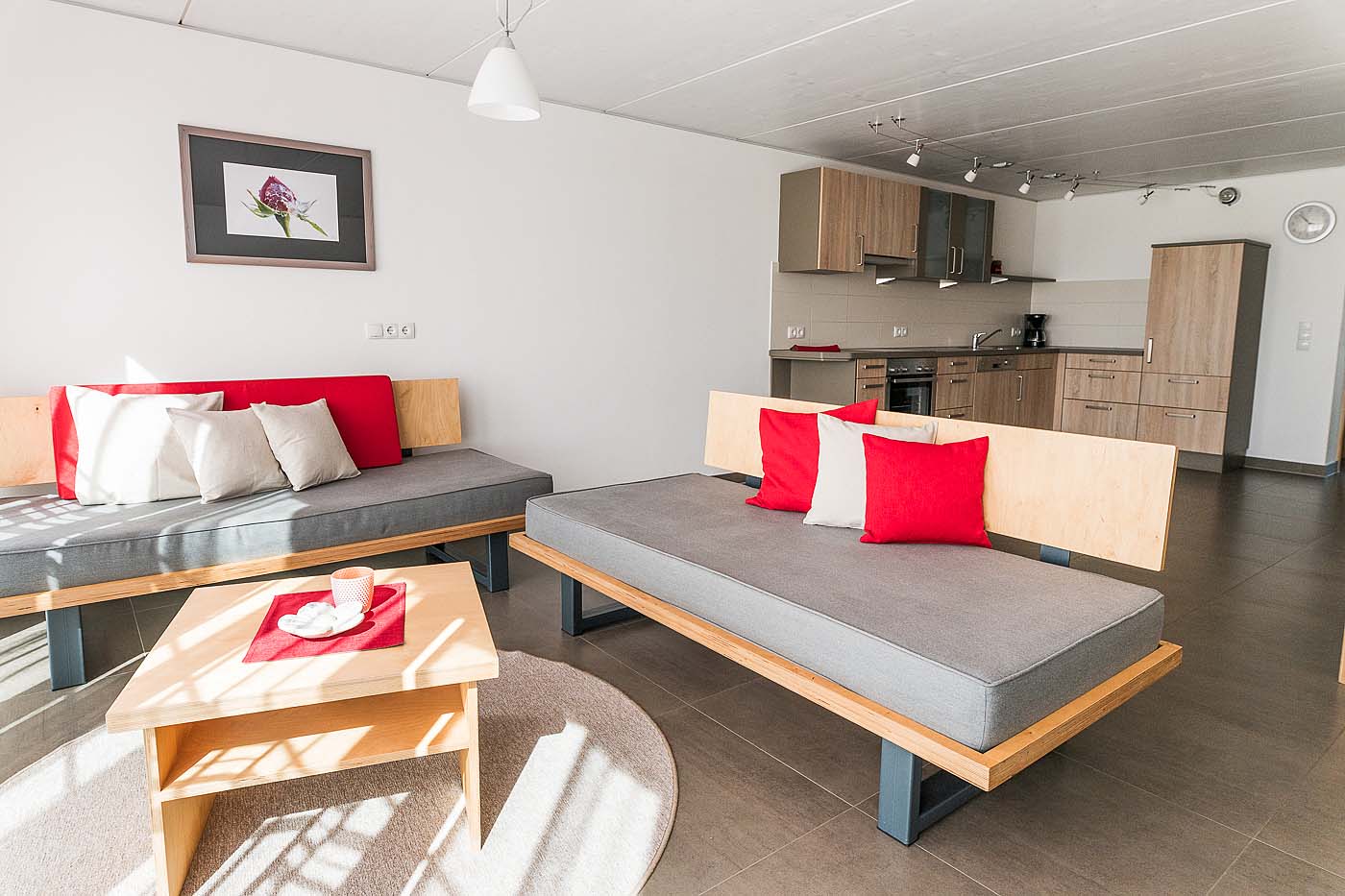 - Großer Wohnraum mit kuscheligem Sofa, Fußbodenheizung und Fernseher.
