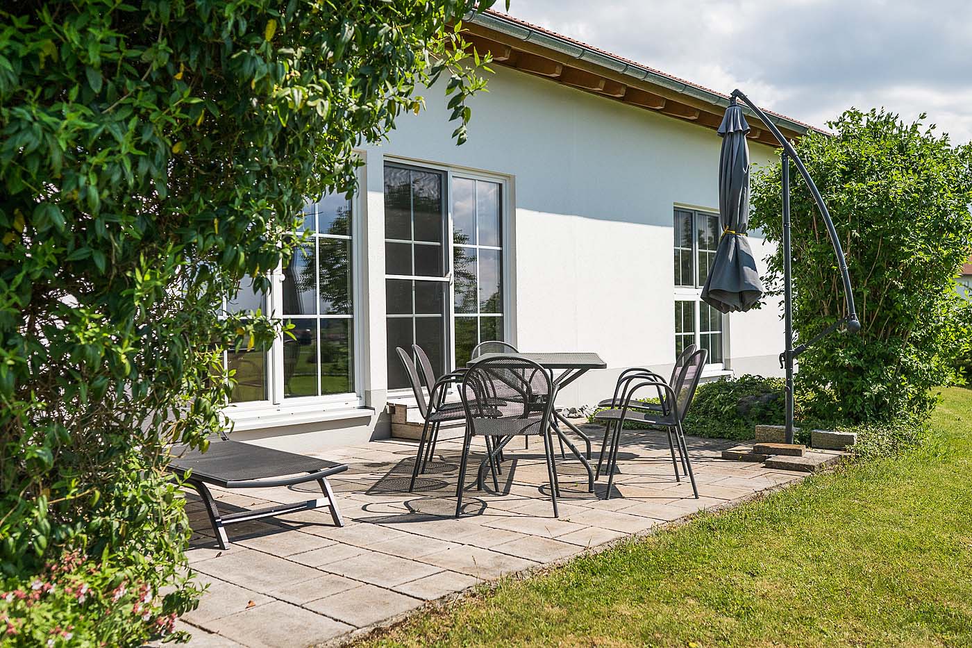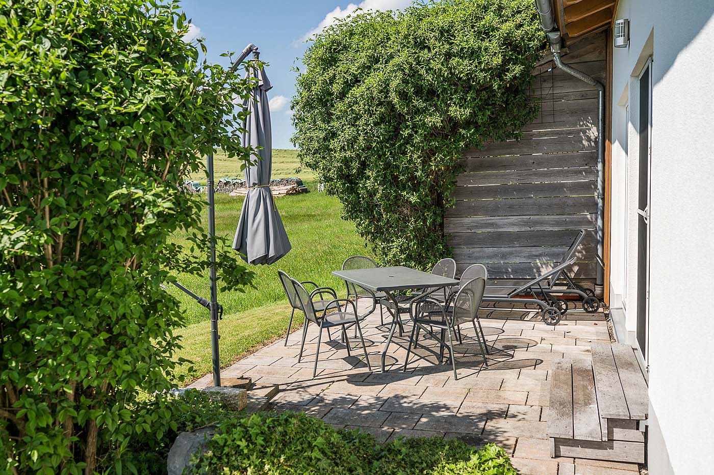- Wunderschöne Gartenterrasse mit Sonnenschirm, Sitz- und Liegemöbeln.